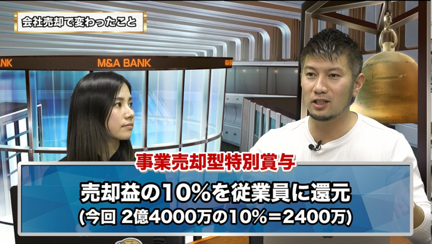 ただ、僕は「社長はいい思いしてるよね」という状況にするのではなく、事業の過程を作ってきたメンバーにも分配したいなと思ったので、「事業売却型特別賞与」というものを設定しました。今回2億4千万円で売却しましたが、そのうちの10%の2400万は従業員に還元したんです。