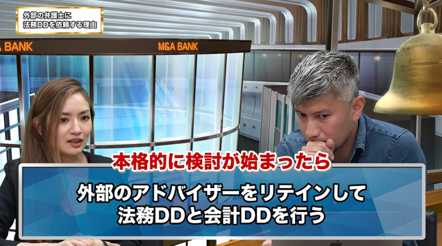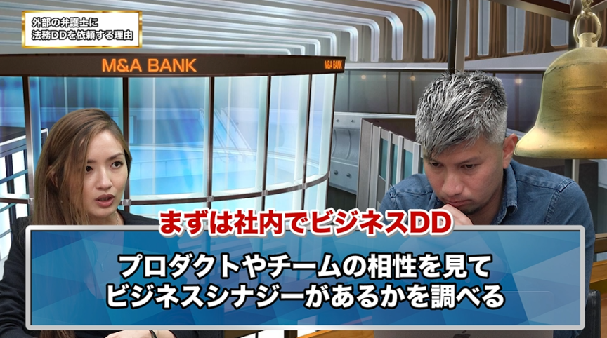 ビジネスのシナジーが見込めそうだとわかってきてから外部のアドバイザーをリテインして、法務面や会計面を見ていく流れかなと思います。