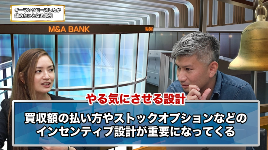 買収価格の払い方や、買った後のインセンティブ、ストックオプションみたいのものをどう出すか。ただ義務として縛るだけだとおっしゃる通りやる気がなくて全然コミットしてくれないケースも出てくるので、やる気にさせるような設計は、買う側にとっても非常に大事ですね。